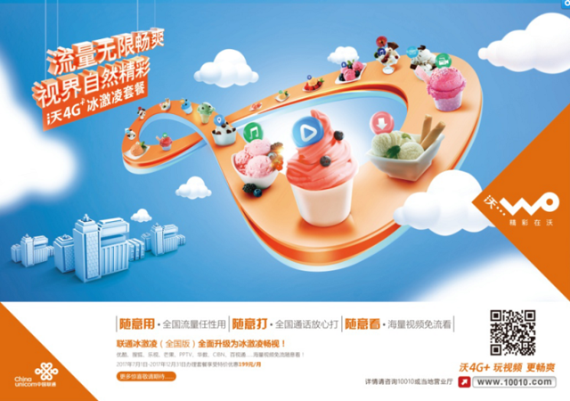 不限流量、不限语音的冰激凌套餐,将给用户带来夏天享受冰激凌一样的畅爽感,是一款彰显联通个性的产品,作为业界首创,冰激凌套餐产品显示了中国联通一直以来保持着的活力与创新。