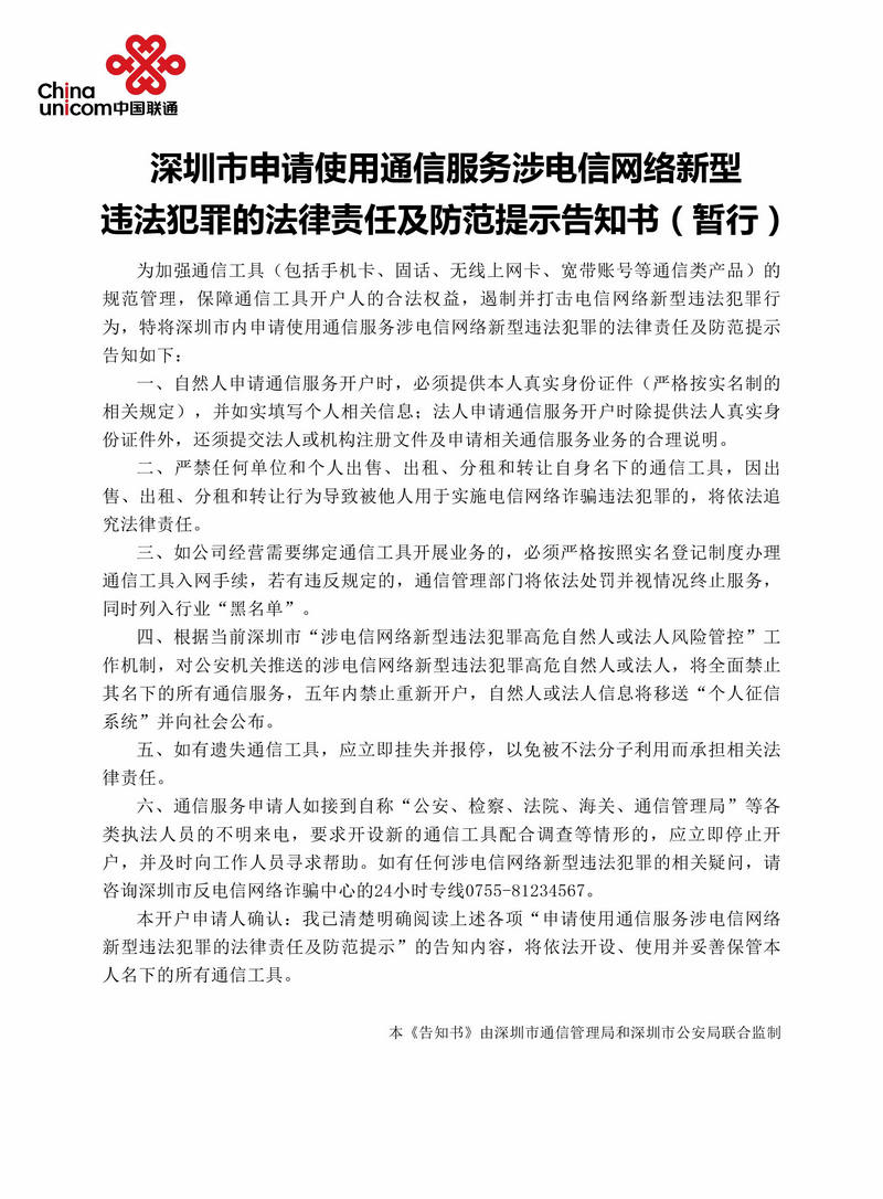 深圳市申请使用通信服务涉电信网络新型违法犯罪的法律责任及防范提示告知书(暂行)