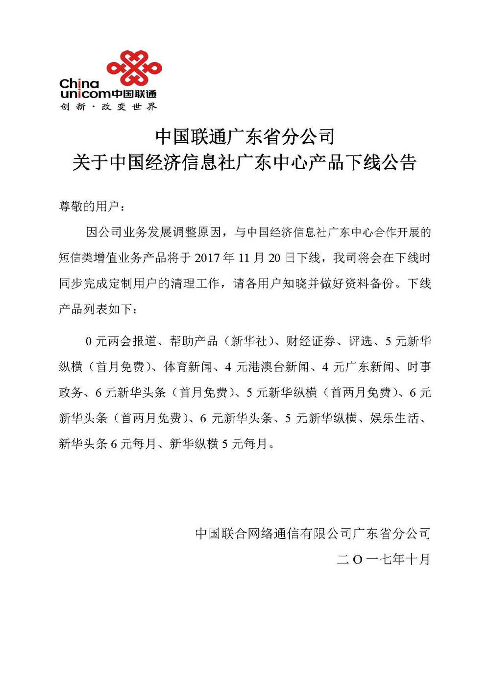 关于中国经济信息社广东中心产品下线公告(中国联通广东省分公司)
